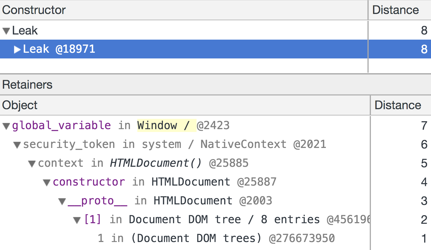 DevTools에서 힙 스냅 샷을 찍어 개체의 유지 경로를 검사 할 수 있습니다. 힙 스냅 샷은 V8 힙의 모든 오브젝트를 정확하게 캡처합니다. 최근까지는 C ++ DOM 객체에 대한 대략적인 정보 만있었습니다. 예를 들어 Chrome 65에서는 Leak
