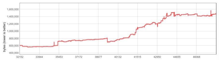 지난 2 년 동안 스냅 샷 크기는 거의 3 배 증가하여 2016 년 초 약 600KB에서 현재 1500KB 이상으로 증가했습니다. 이 증가의 대부분은 직렬화 된 Code