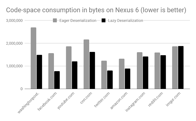 Google은 게으른 비 직렬화의 유무와 상관없이 Android 기기에서 Chrome 65를 사용하여 가장 인기있는 상위 1000 개 웹 사이트를로드하여 메모리 사용량을 평가했습니다.