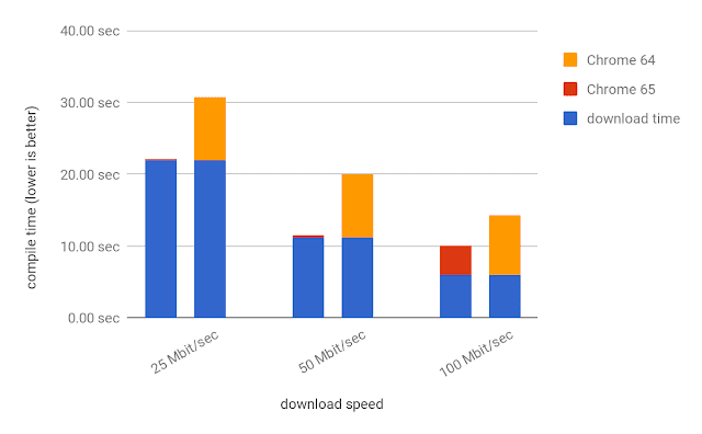 다운로드 시간이 WebAssembly 모듈의 컴파일 시간 (예 : 위의 그래프에서 25 Mbit / sec 및 50 Mbit / sec)보다 길면 WebAssembly.compileStreaming()